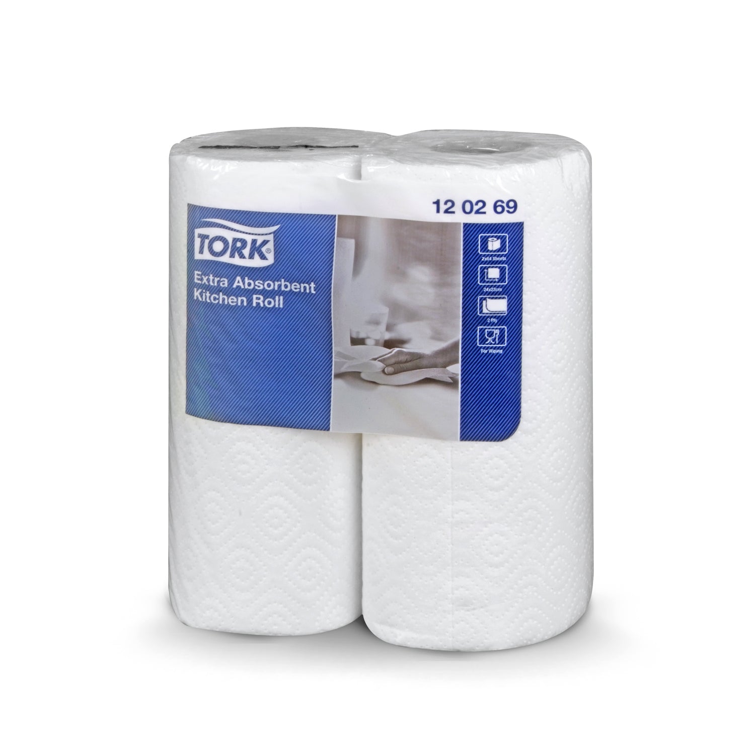 Pack of 2 Rolls. Tork extra absorbent kitchen roll is suitable for everyday wiping tasks, such as wiping surfaces, water and oil or taking up food remains. It's certified by EU Ecolabel - 2Ply