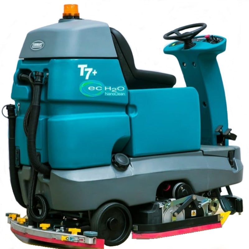This ride-on scrubber, cleans both large areas and tight spaces easily with a floor scrubber designed for greater efficiency and less environmental impact. The machine uses Tennant's innovative ec-H2O Nano Clean® technology to reduce the amount of detergent and water needed.
