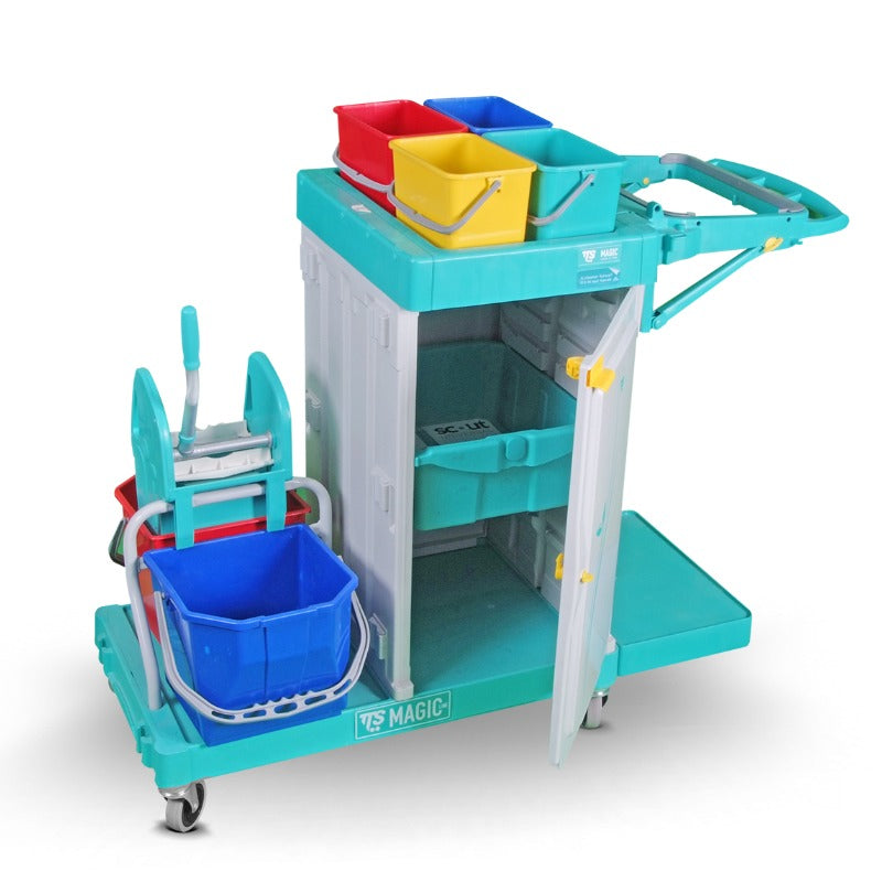 Trolley consisting of 4 buckets, 2 shelfs and 2 drawers with a garbage bag base